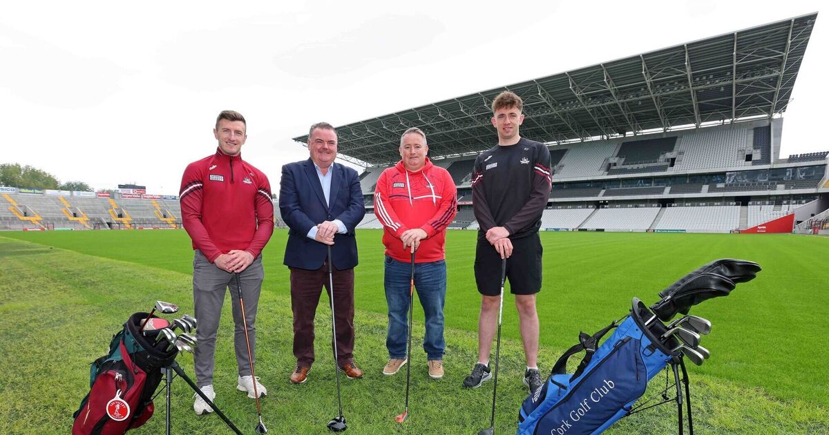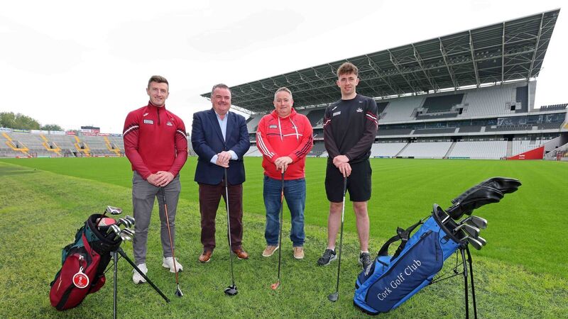 The late John Mullins (second from left) pictured with Cork hurling manager Pat Ryan at the launch of the Cork Senior Hurlers' Golf Classic in September of last year. Also included are Cork hurlers Patrick Horgan (far left) and Ethan Twomey. Picture: Jim Coughlan