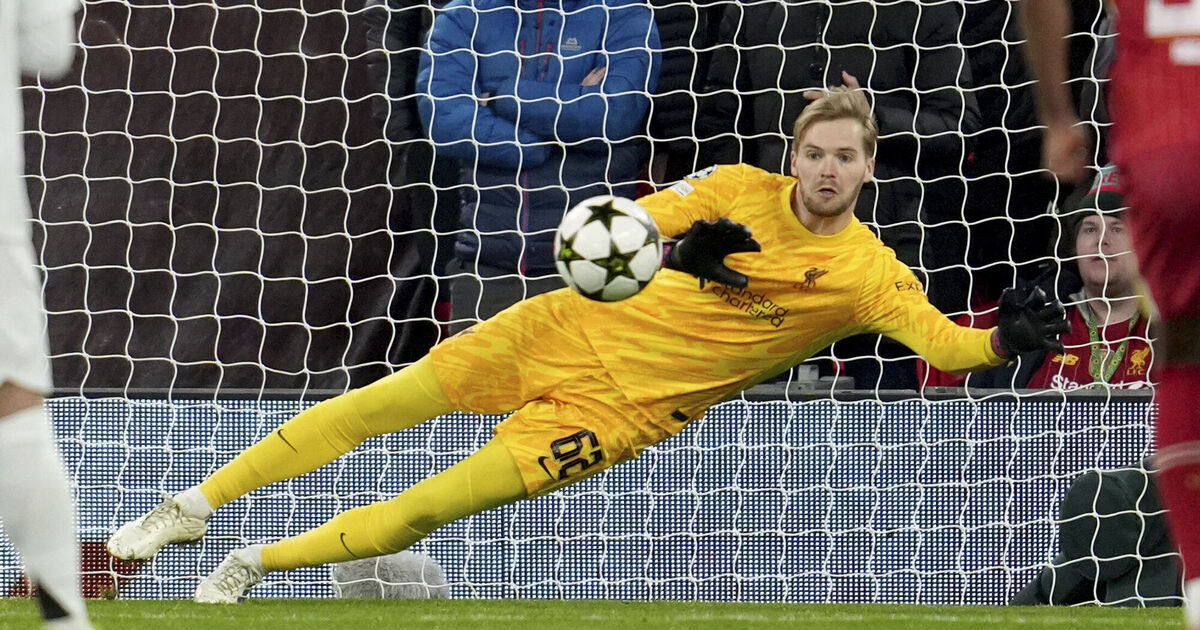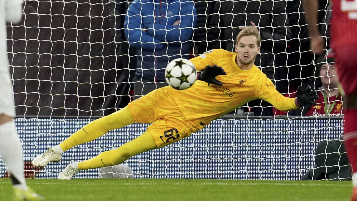 Liverpool's goalkeeper Caoimhin Kelleher stops a penalty shot from Real Madrid's Kylian Mbappe during the Champions League match at Anfield Stadium, Liverpool, England, Wednesday, Nov. 27, 2024. (AP Photo/Jon Super)