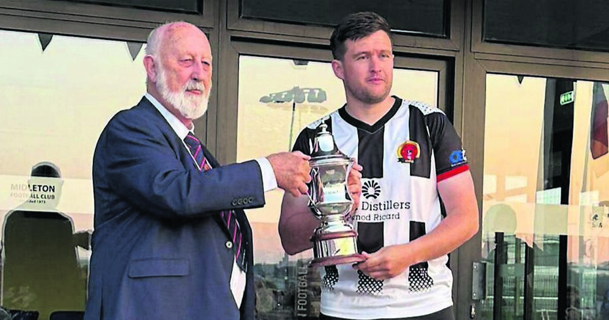 Sean O’Sullivan, Munster Senior League, presents the Beamish Stout Senior Premier Division trophy to Midleton captain Jake Hegarty.