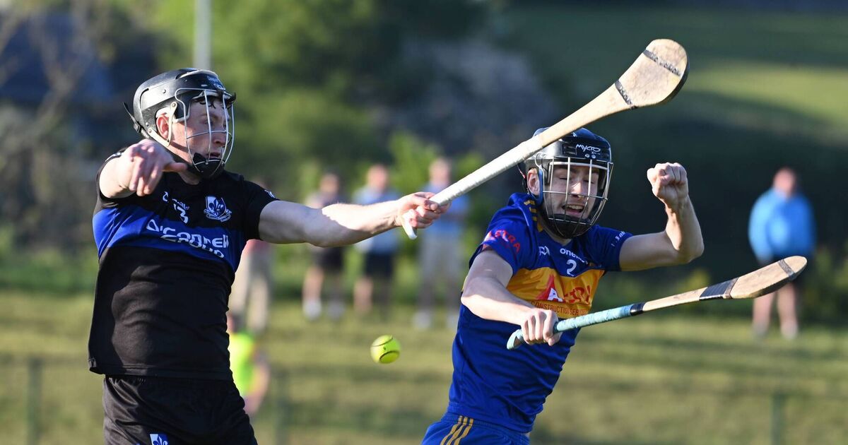 Carrigaline's Nathan O'Keeffe and Sarsfields' Jack O'Connor tussle for the sliotar during the Red FM HL Division 1 game at Carrigaline. Picture: Eddie O'Hare