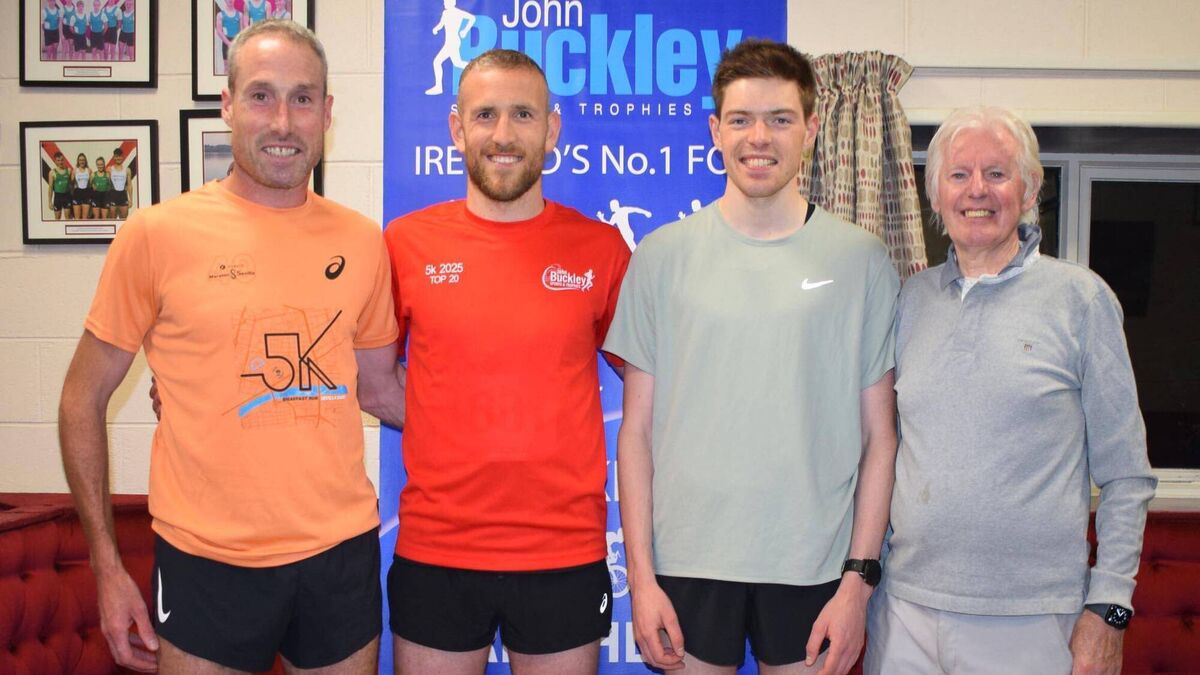First three in the John Buckley Sports 5km pictured with sponsor John Buckley: Michael Harty (second), Denis Hegarty (first), Gavin O'Rourke (third). Picture: John Walshe