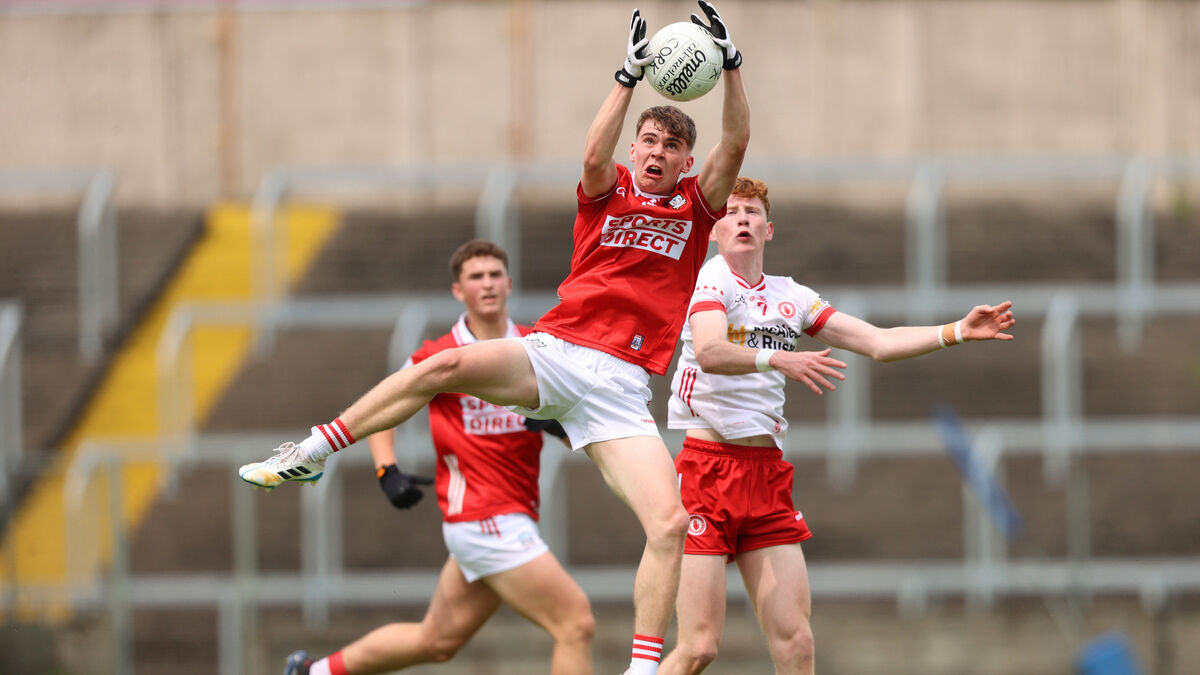 Cork's Jack Byerley jumps for a dropping ball against Tyrone. Picture: INPHO/Leah Scholes