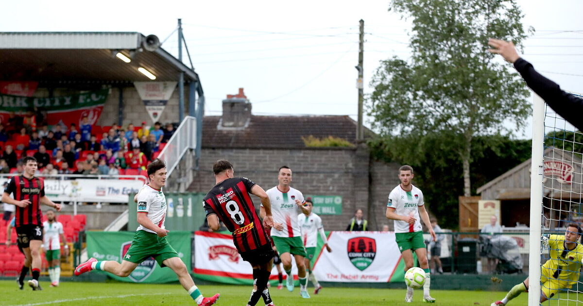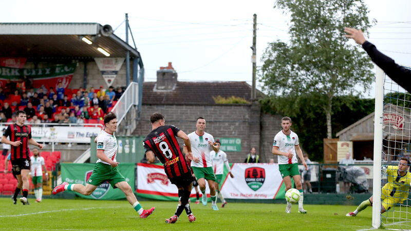 Dayle Rooney scores Bohs' second goal against Cork City. Picture: Michael P Ryan/Sportsfile