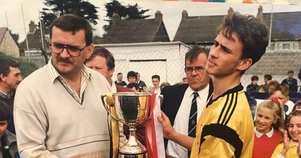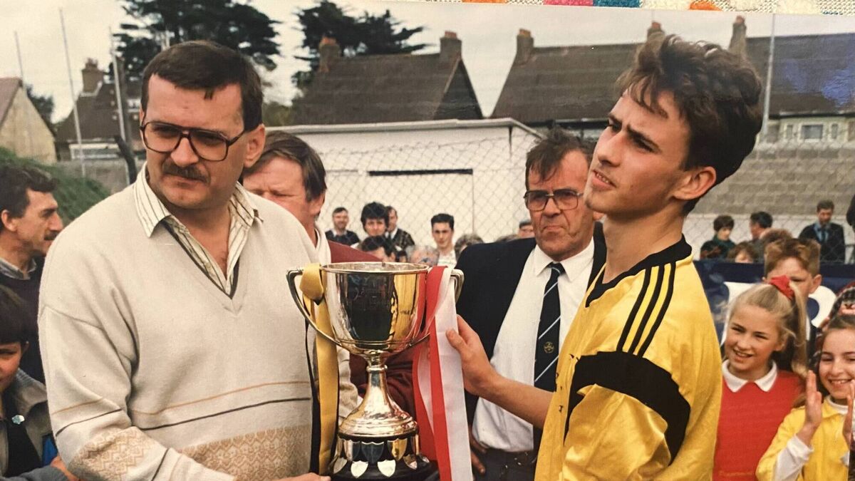Michael O’Driscoll presents the Business League AIB Cup to victorious Cork Examiner captain Peter O’Callaghan following the 3-0 win over Roches Stores at Turner’s Cross in 1991. Picture: Finbarr Buckley.