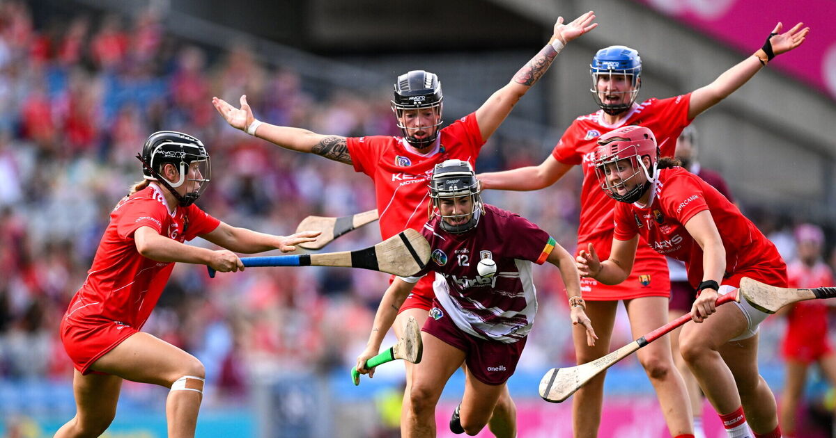 Aoife Donohue of Galway in action against Cork players Laura Treacy, Ashling Thompson, Aoife Healy and Sorcha McCartan at Croke Park. Picture: Ramsey Cardy/Sportsfile