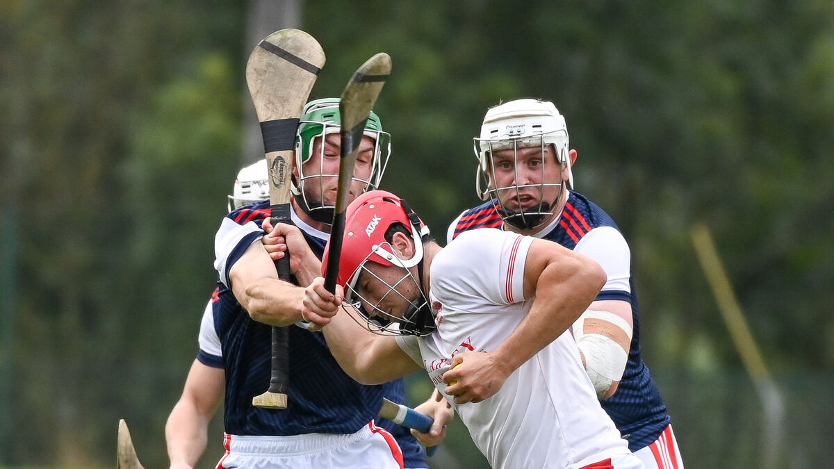 Blarney's Patrick Crowley is strongly challenged by Watergrasshill's Patrick Cronin, during their Senior 'A' HC clash at Grenagh.