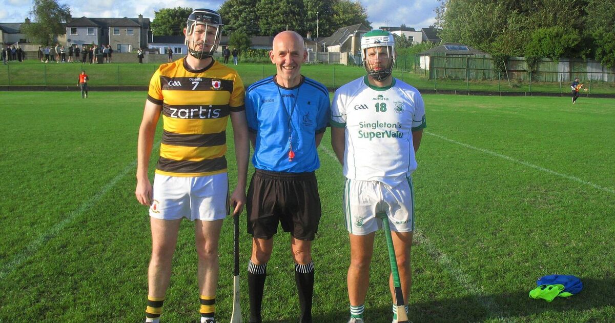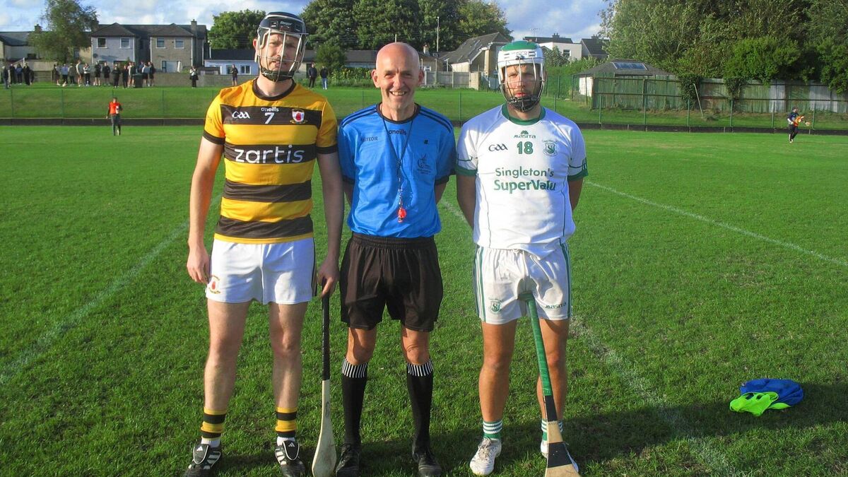 Referee Cathal McAllister accompanied by captains Paul Cunningham (Na Piarsaigh) and Anthony Harte (St Vincent's) at Ballinlough.