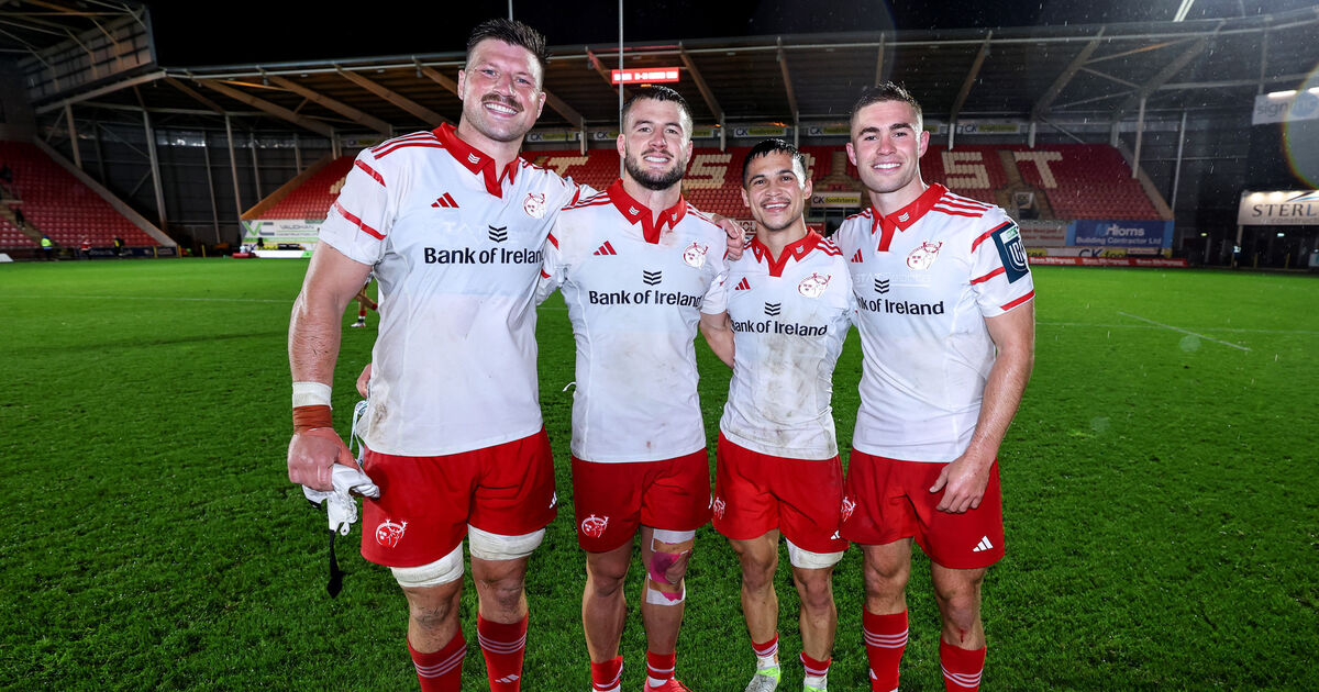 Scarlets vs Munster: Munster's Fineen Wycherley, Alex Nankivell, Thaakir Abrahams and Jack Crowley celebrate after the game