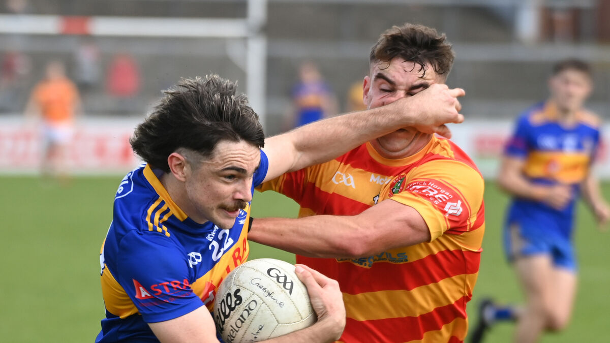 Carrigaline's Kevin O'Reilly holds off Newcestown's Paul Kelly during the McCarthy Insurance Group Cork Premier SFC quarter-final at Páirc Uí Rinn. A highly entertaing game, it went all the way to penalties before Newcestown prevailed Picture: Eddie O'Hare