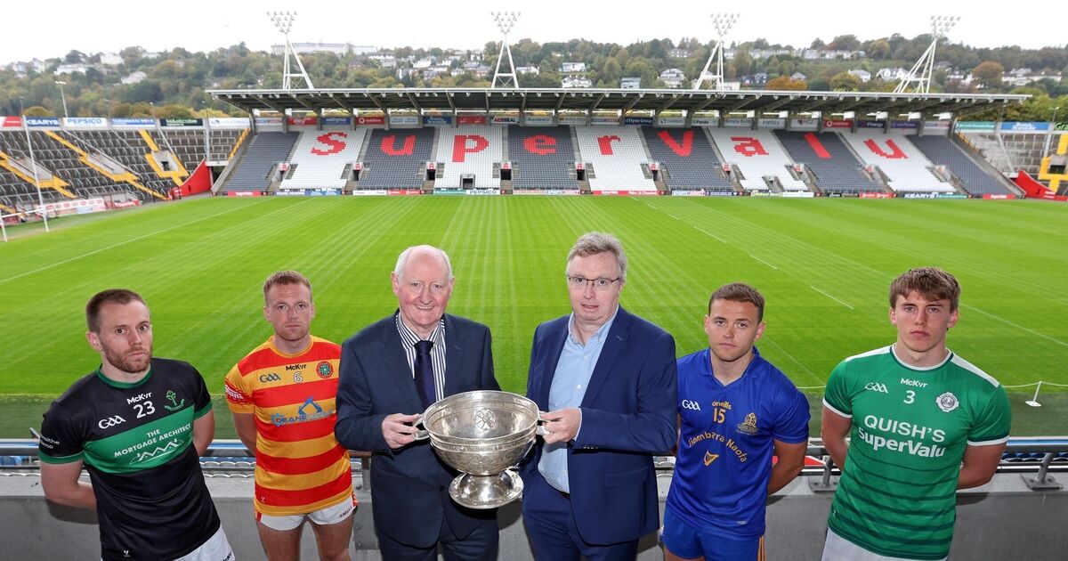 Newcestown's Luke Meade (second from left) pictured at SuperValu Páirc Uí Chaoimh with Alan O'Donovan (Nemo Rangers), Cork County Board chairperson Pat Horgan, Brendan Harrington of McCarthy Insurance Group, Steven Sherlock (St Finbarr's) and Liam O'Connell of Ballincollig. Picture: Jim Coughlan