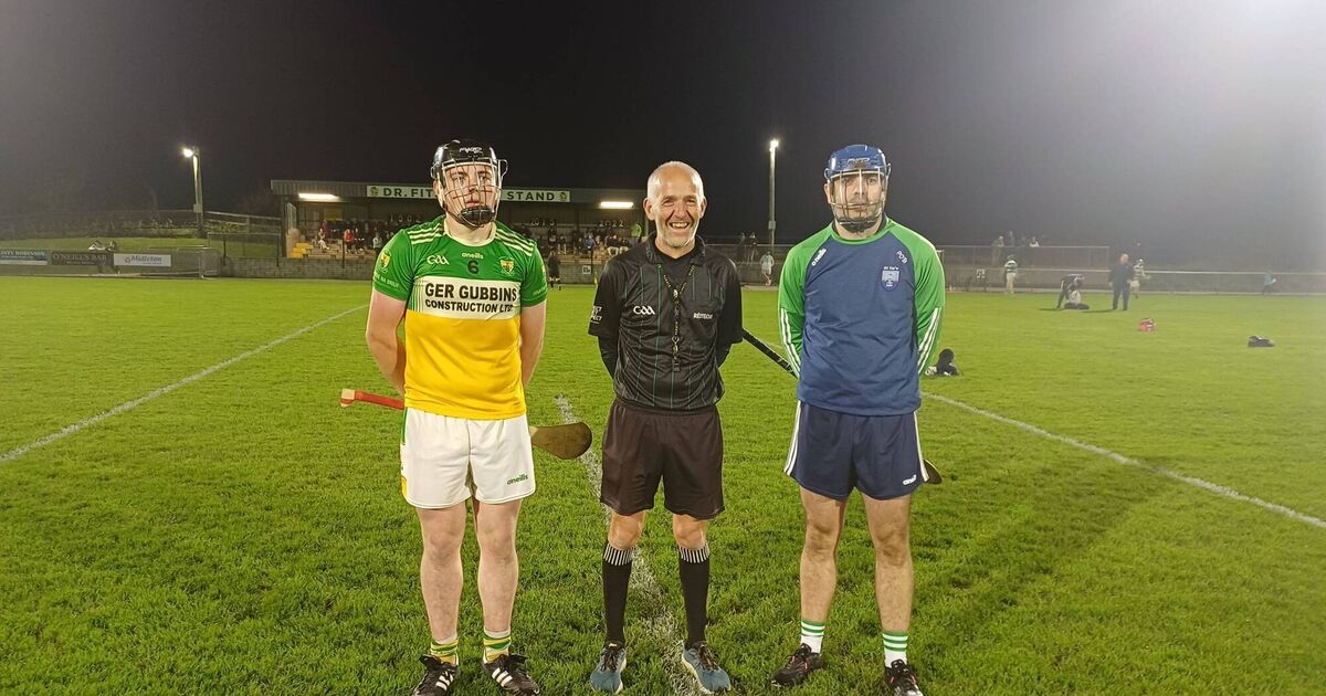 Bride Rovers captain Liam Collins with St Ita's captain Padraigh O'Brien and referee Cathal McAllister ahead of the East Cork JAHC semi-final.