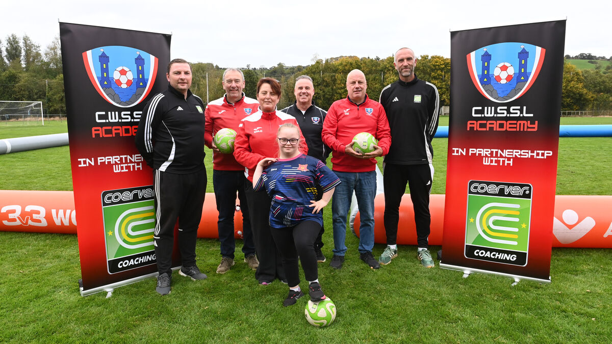 (rear left) Denis Behan and (rear right) Derek Coughlan of Coerver Coaching with Brian Murphy, Chairperson, CWSSL, Maria McGrath, treasurer, CWSSL with Saoirse McGrath, Colin Gurhy, Development Officer, CWSSL and Sean Murphy, Sec, CWSSL, at the launch of the new soccer training programme for CWSSL girls at the Casement Celtic pitch at Carrigrohane Road, Co Cork. ECHO Sport. Picture: Larry Cummins