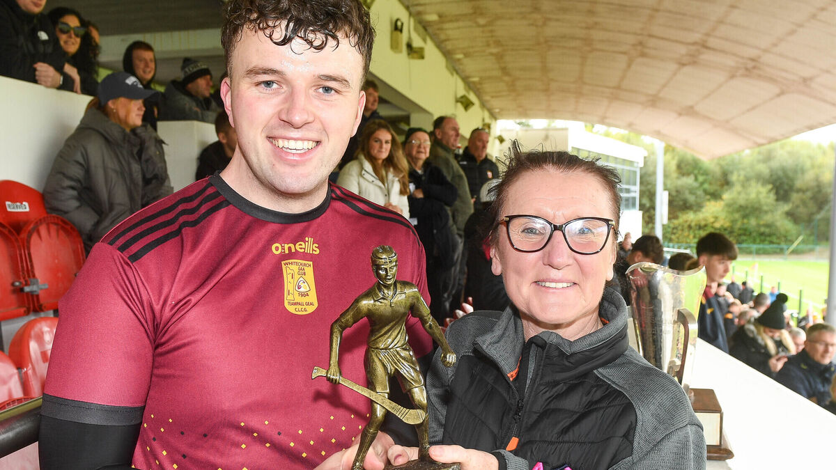 Jess O'Sullivan of AOS Security (sponsor) presents the man-of-the-match award to Con Mulcahy of Whitechurch after they defeated Na Piarsaigh in the AOS Security City Division Junior A hurling championship final replay at the MTU sports grounds. Picture: David Keane
