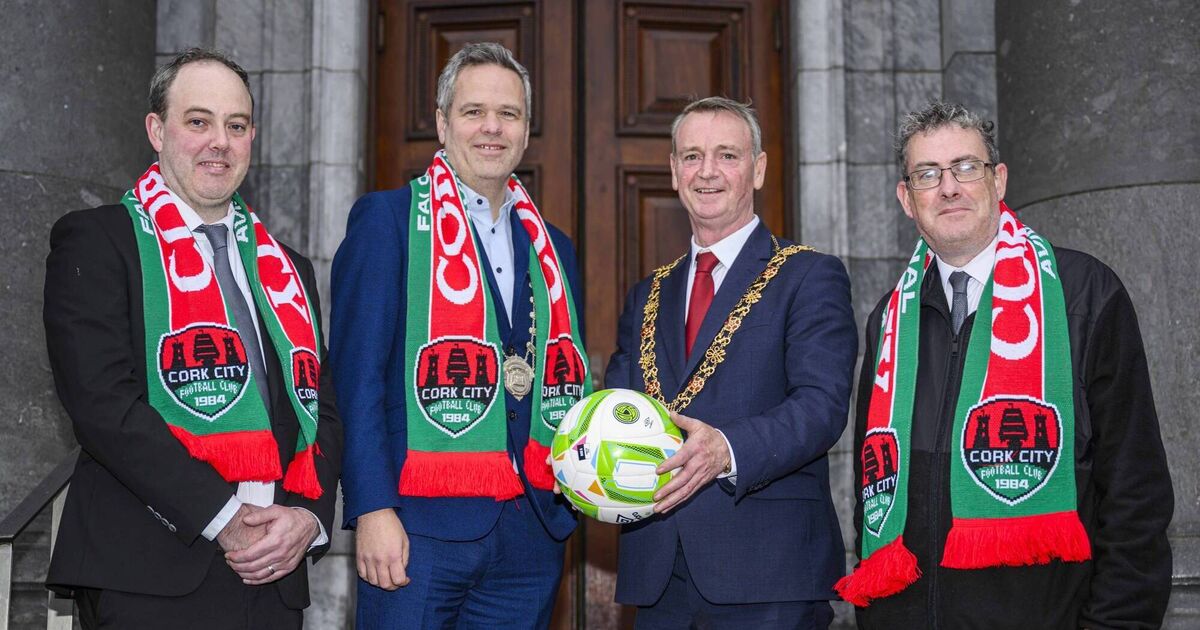 Lord Mayor Cllr Fergal Dennehy and President of the Cork Business Association Dave O’Brien of Xeinadin showing their support for Cork City FC ahead of the FAI Cup final, with Cork City's Eanna Buckley and Anthony O’Sullivan. Picture: Doug Minihane