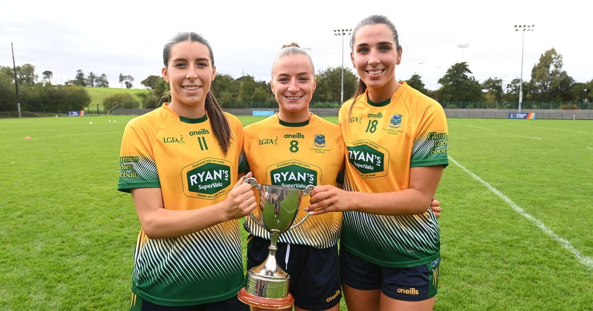 Sisters Niamh, Olivia, and Aishling McAllen with the cup after Glanmire won the Cork Credit Unions Senior B ladies football championship at MTU recently. They hope to add the Munster title today. Picture: Larry Cummins