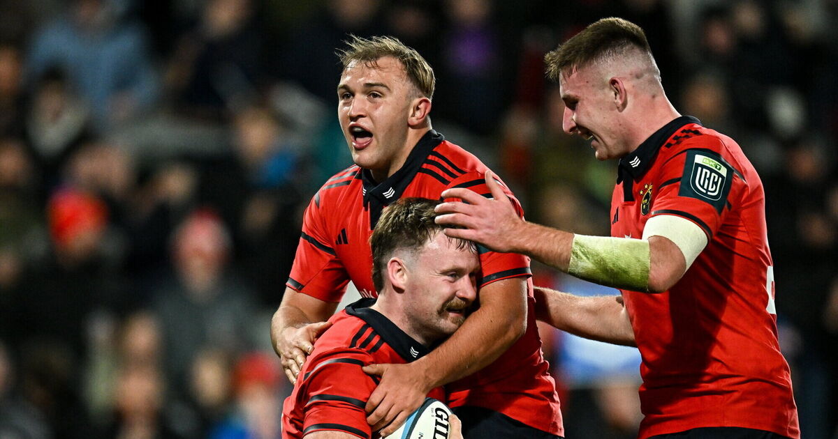 Sean O'Brien of Munster, left, celebrates with teammates Max Clein and Ben O'Connor after scoring their side's fifth try. Picture: Sam Barnes/Sportsfile