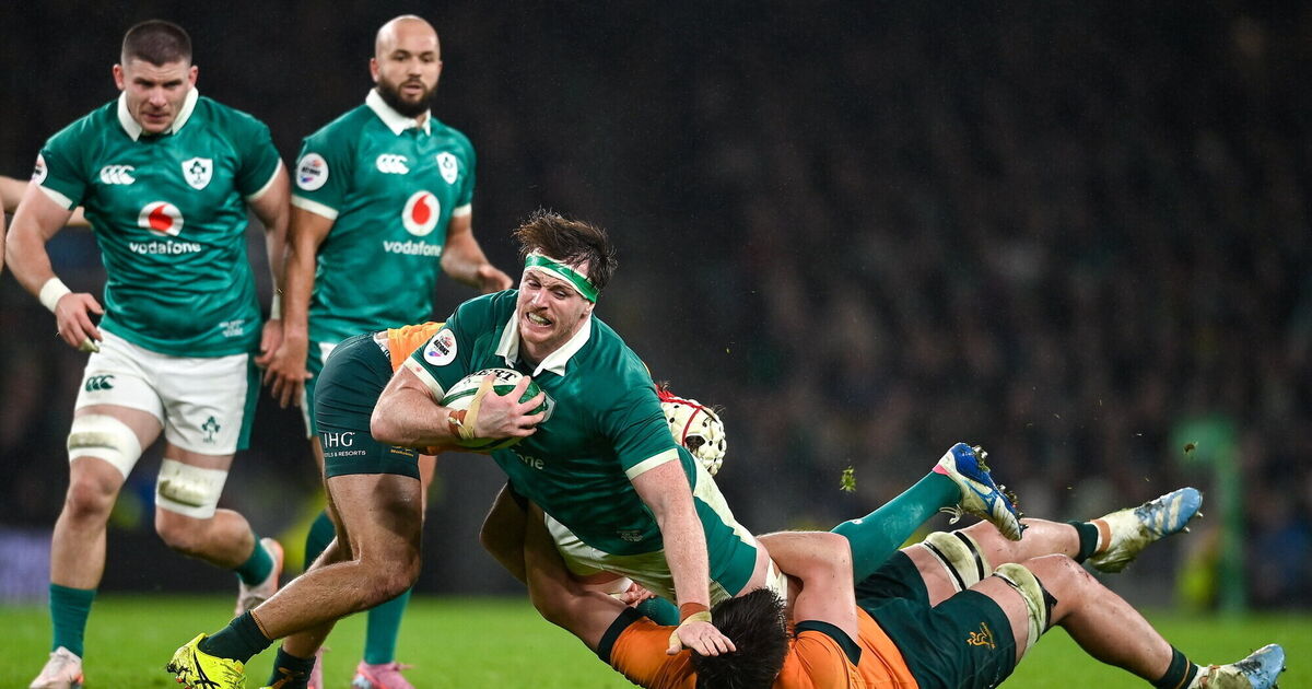 Prendergast’s replacement Jack Crowley clipped over a penalty with his first touch in the 62nd minute to push Ireland’s lead out to 11, and in the 69th minute captain Caelan Doris made sure of the win when he bustled over in the left corner to ensure that Ireland passed the 30-point barrier against Australia for the first time in Test match history.