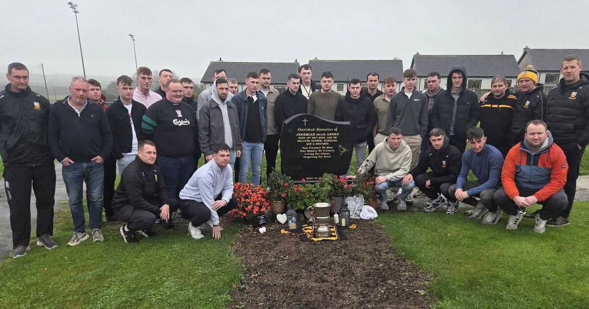 The Buttevant players at the grave of Miah Ahern after winning the Premier JFC title last month.