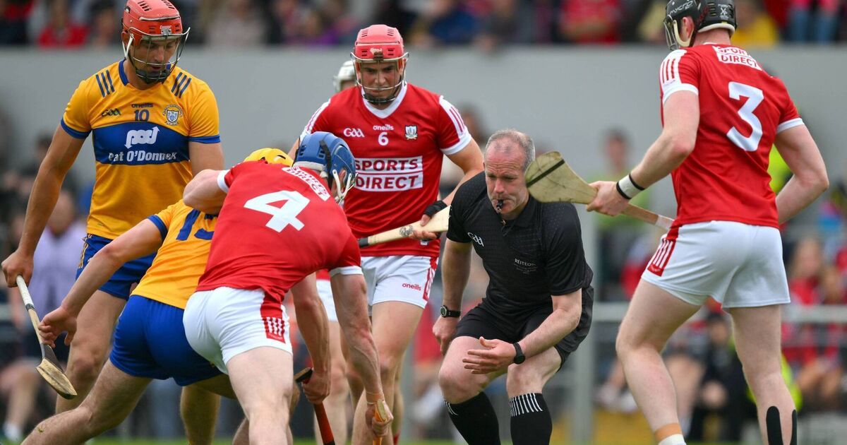 Referee Johnny Murphy throws in the sliotar during the Munster Hurling Championship match between Clare and Cork at Cusack Park. Picture: Ray McManus/Sportsfile