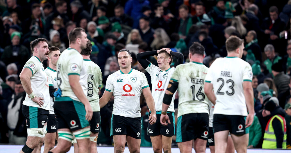 Ireland's James Lowe and Sam Prendergast dejected after the match on Saturday night. Picture: INPHO/Dan Sheridan