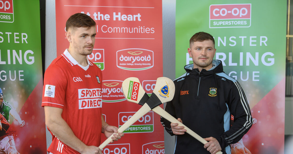 Mark Coleman of Cork and Tipperary's Willie Connors at the launch of the 2026 Co-op SuperStores Munster Hurling League in Raheen, Limerick. Picture: Dan Linehan