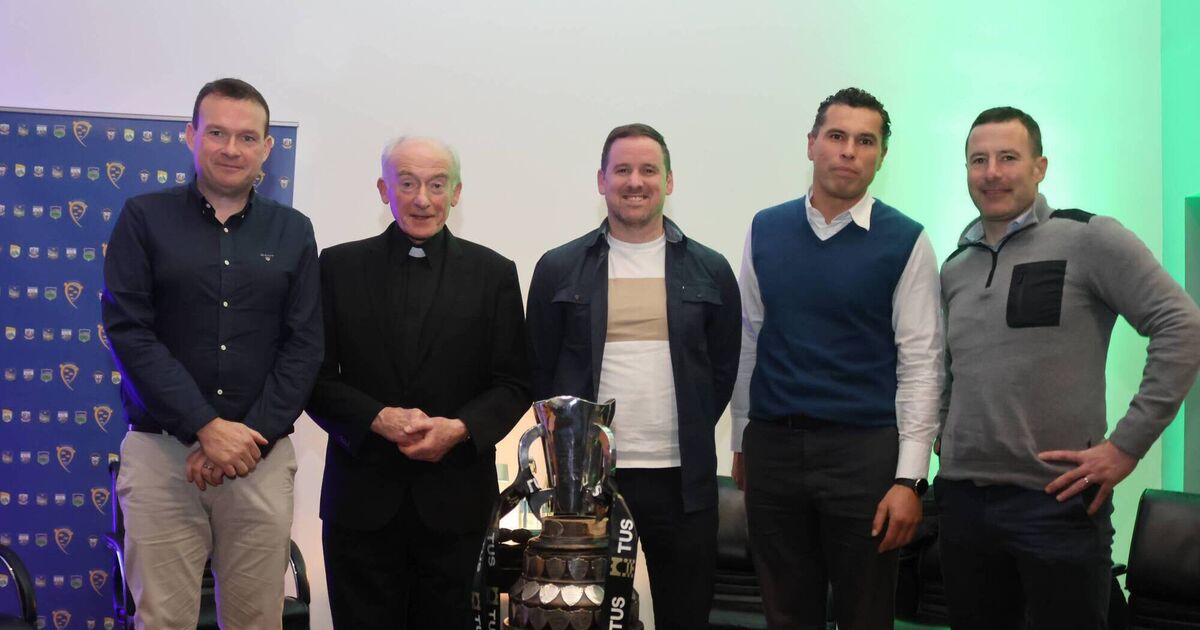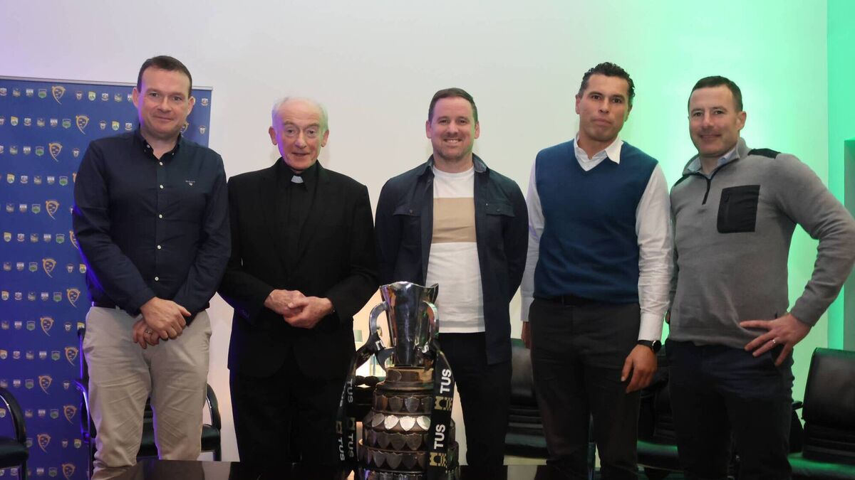 Former Harty Cup winners pictured at the launch of the Dr. Harty Cup History book were (left to right): Damian Lawlor (MC), Monsignor Christy O'Dwyer, Colin Ryan, Seán Óg Ó hAilpín and Andrew O'Shaughnessy.