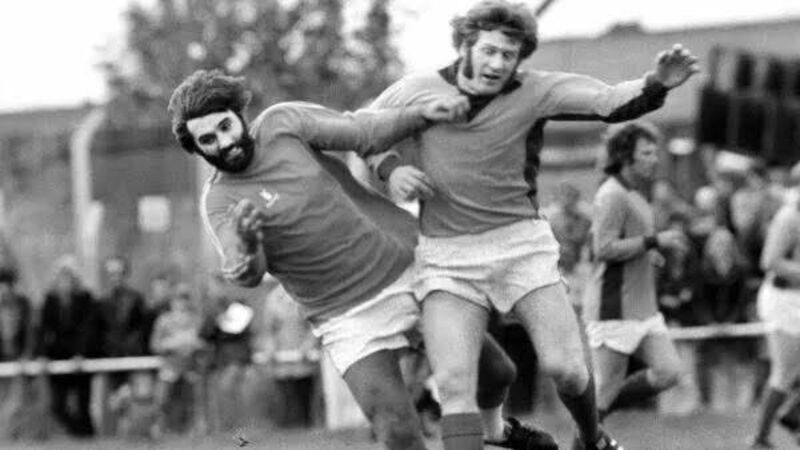 Paddy Shortt puts a tackle in to bring a mazy dribble by George Best to an end in the match against Dunstable Town in 1975. It was after this game that Best was first asked about the possibility of playing for Cork Celtic.