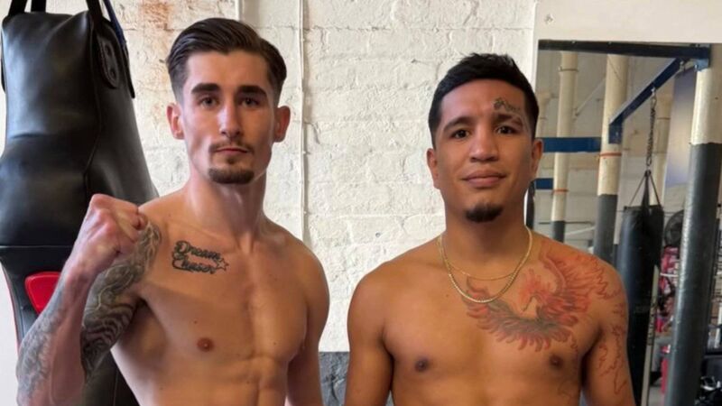 Cork boxer Steven Cairns with Cesar Ignacio Paredes after both making weight before their fight at the Vaillant Live Arena in Derby.
