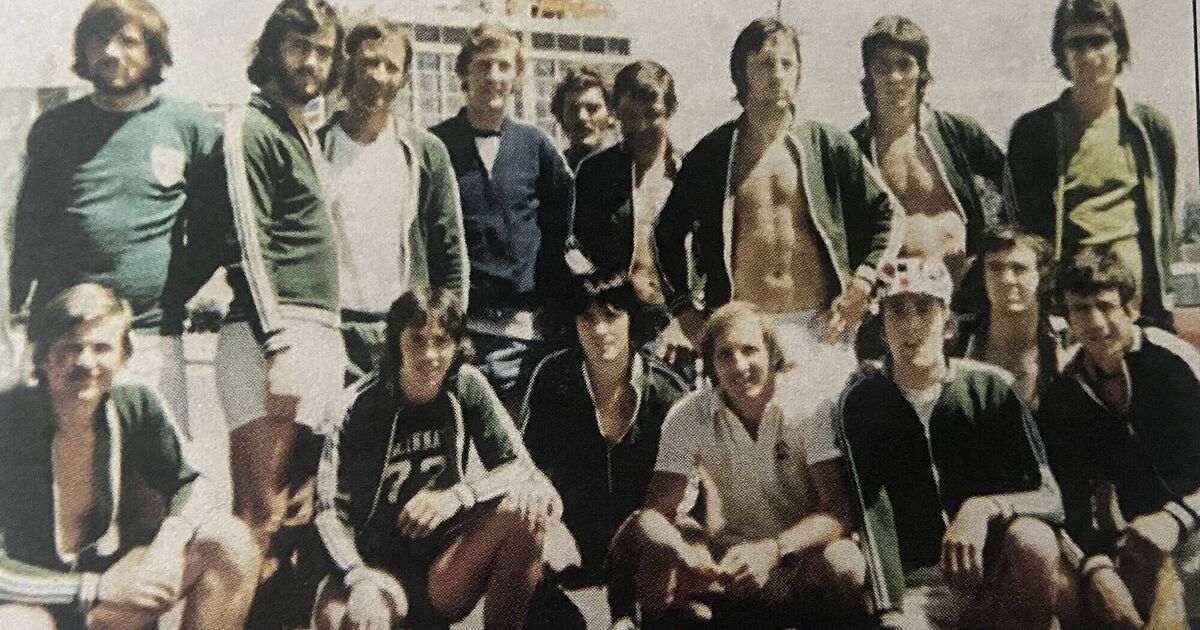 Cork Hibernians US tour June 1976 squad photo. Back: Martin Sheehan, Damien Richardson, Noel O’Mahony, Gerry Finnegan, Bobby Tambling, Dave Kirby, Bryan McSweeney, Pat Kirby. Front: Peter Gregson, Paul Daly, Carl Humphries, Peter Thomas, Ger Spillane, Pat Morley, Adrian Walsh.