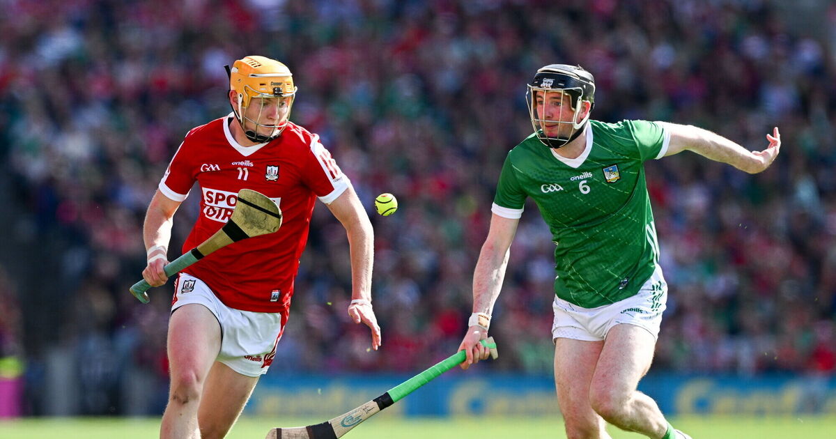 Shane Barrett of Cork is tackled by Declan Hannon of Limerick during the GAA Hurling All-Ireland Senior Championship semi-final match between Limerick and Cork in 2024. Picture: Ray McManus/Sportsfile