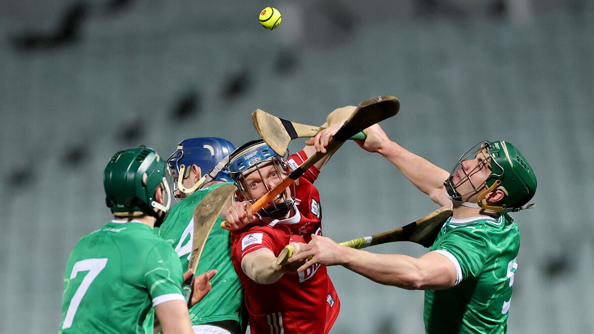 Limerick’s Matthew Fitzgerald, Eddie Stokes and Chris Thomas battling Cian Darcy of Cork in preseason action. Picture: INPHO/James Crombie