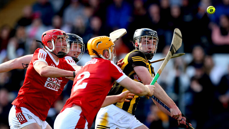 Kilkenny’s Billy Drennan with Niall O’Leary and Ciarán Joyce of Cork during the 2023 National Hurling League semi-final at UPMC Nowlan Park. Picture: ©Inpho/Ryan Byrne
