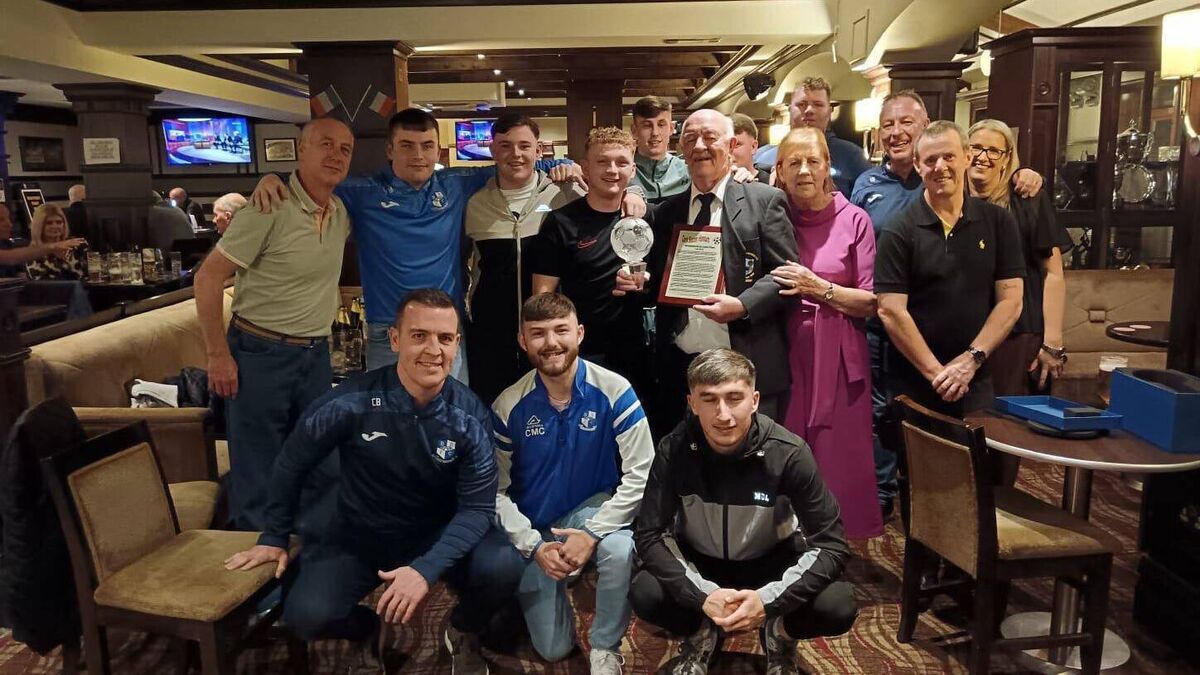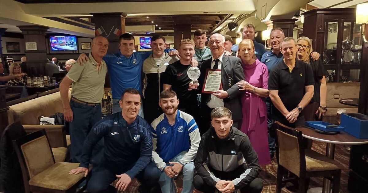 Members of Blackstone Rovers celebrating with their President Tony Bevan after he received a Cork Honorary award from the Cork AUL.