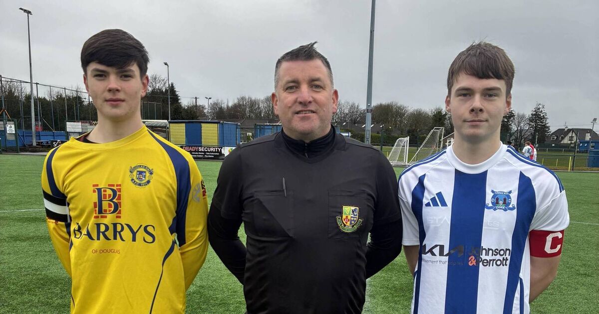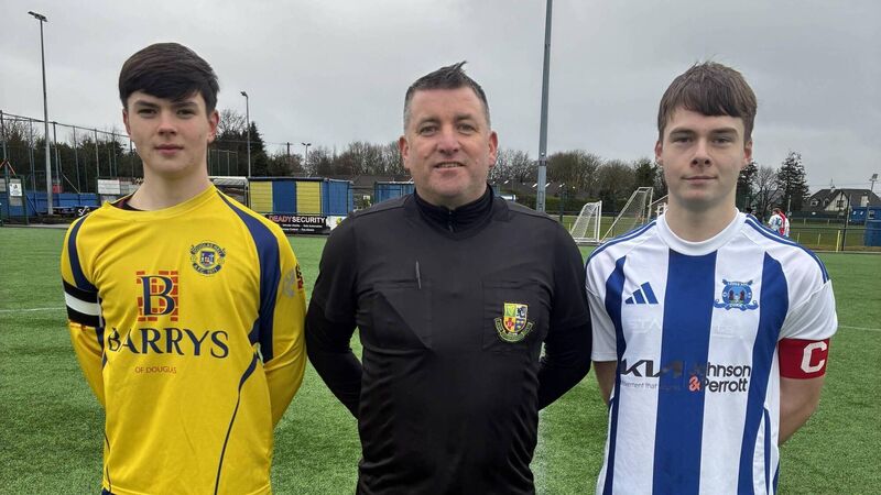 Youth Soccer: Douglas Hall captain Darragh O’Flaherty, referee Dave Finnegan and Leeds captain Adam Patterson before their Daly Industrial Supplies U17 Premier game at Moneygourney.