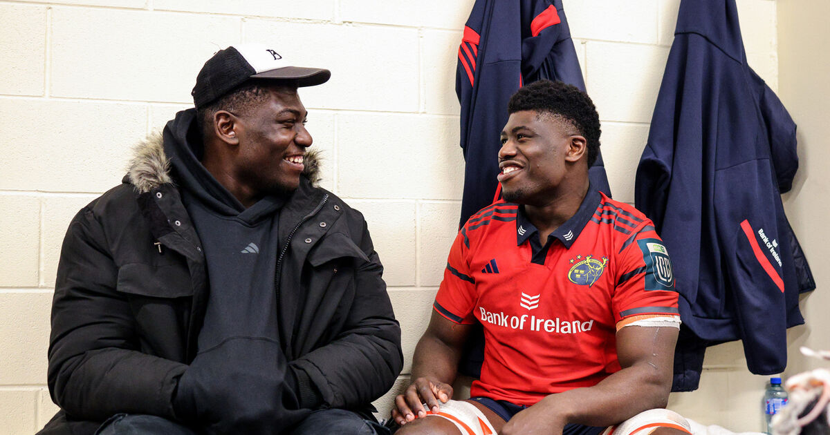 Munster's Edwin Edogbo with his brother Sean Edogbo in the dressing room after the Dragons game last weekend. Picture: INPHO/James Crombie
