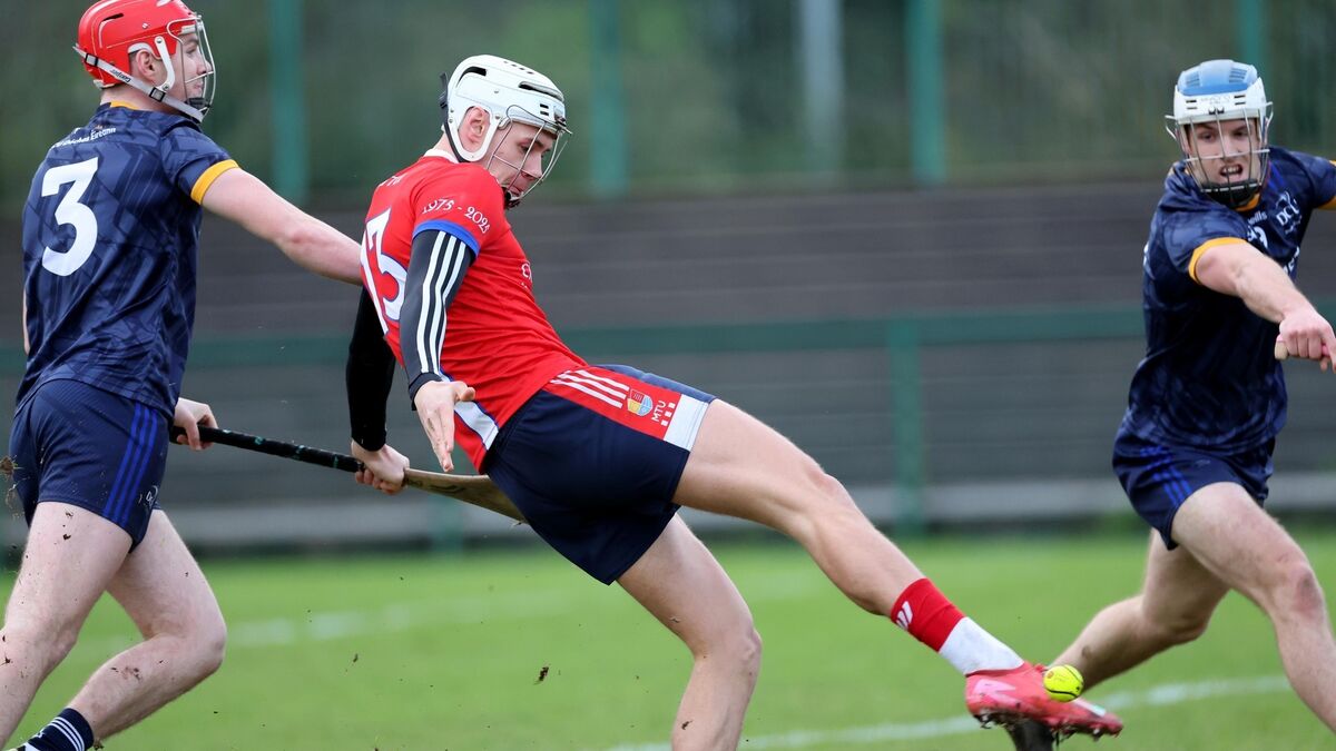 Alan Walsh, MTU Cork, uses his football skills to kick the sliotar away from Sam Bourke and Dan O'Meara, DCU, in the Electric Ireland Fitzgibbon Cup quarter-final. Picture: Jim Coughlan.