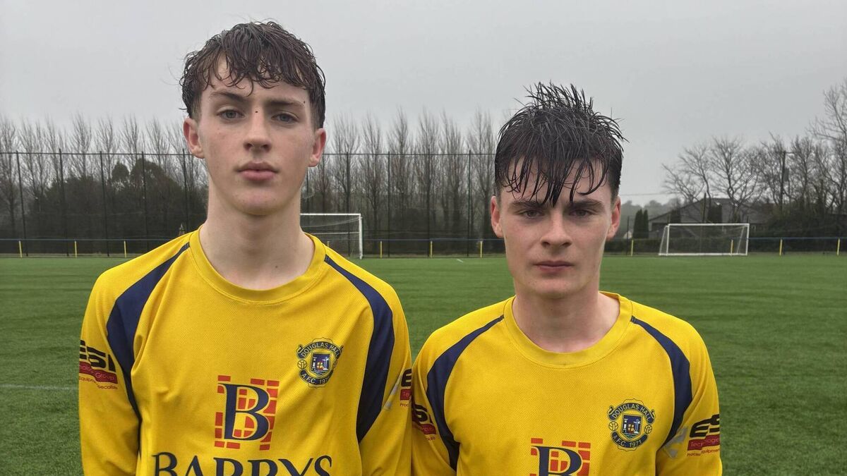 Douglas Hall goal scorers Macdarragh Lynch and Eoin McCarthy after they beat College Corinthians in the U17 Premier League game at Moneygourney last Saturday.