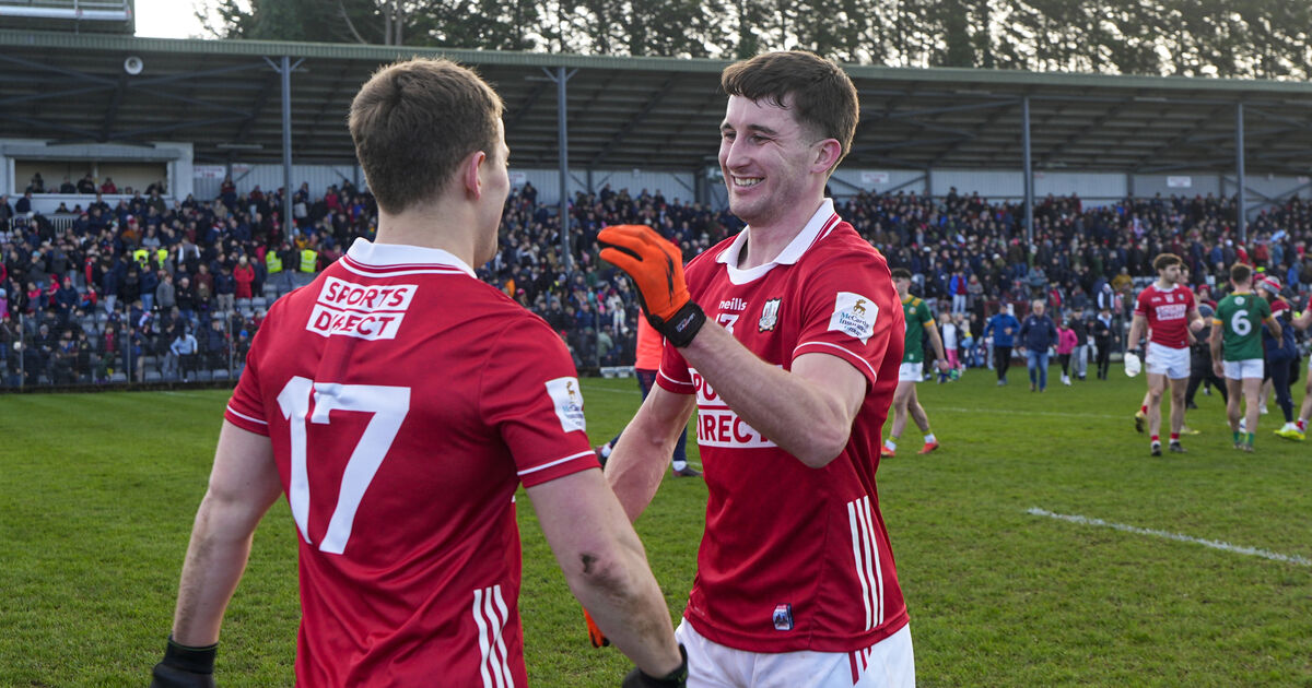 Chris Óg Jones of Cork, on the right, and Kevin O'Donovan celebrate after the win over Meath. Picture: INPHO/James Lawlor