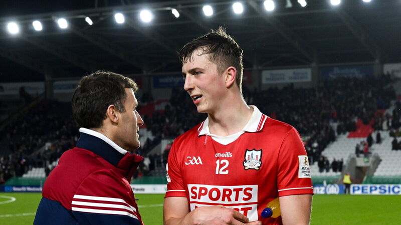 Cork manager Ben O'Connor with Diarmuid Healy after the win over Tipperary a fortnight ago. Healy is among a number of players who will miss Sunday's clash with Kilkenny. Picture: Ray McManus/Sportsfile