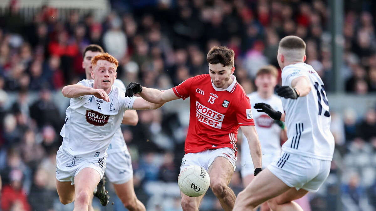 Cork forward Chris Óg Jones lands a two-pointer despite the attention of Kildare's Harry O'Neill and Liam Kelly at Páirc Uí Rinn. Picture: Michael P Ryan/Sportsfile