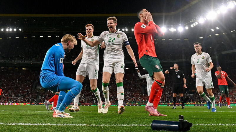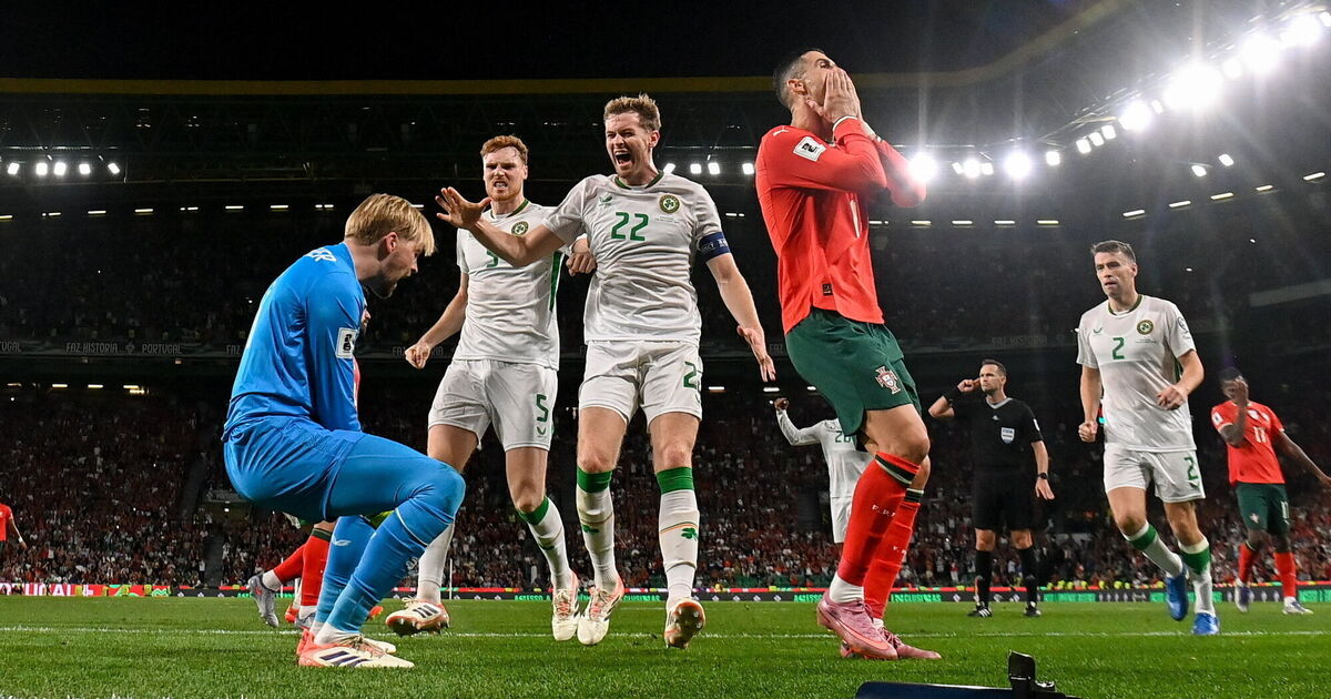 Cristiano Ronaldo of Portugal reacts after his penalty is saved by Republic of Ireland goalkeeper Caoimhin Kelleher during the FIFA World Cup 2026 Group F qualifying match between Portugal and Republic of Ireland at Estádio José Alvalade in Lisbon, Portugal. Photo by Stephen McCarthy/Sportsfile