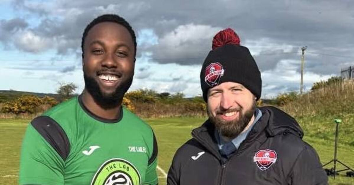 Cork Business League representative Peter Travers presents the Man of the Match to Matthew Ekhosuehi, The LAB, following his hat-trick against DoMA Brazil Giants in the Grandon’s Toyota Premier Division. Picture: Finbarr Buckley