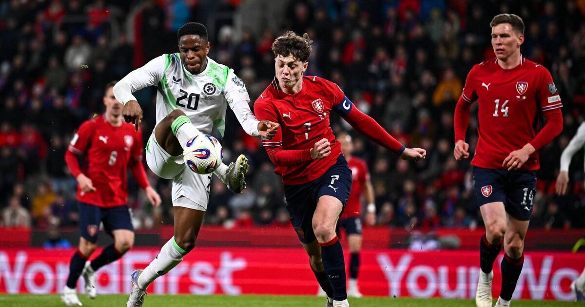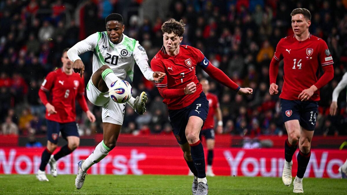 Chiedozie Ogbene of Republic of Ireland in action against Ladislav Krejcí of Czechia during the FIFA World Cup 2026 European Qualifiers play-off semi-final match between Czechia and Republic of Ireland at Fortuna Arena in Prague, Czechia. Photo by Seb Daly/Sportsfile