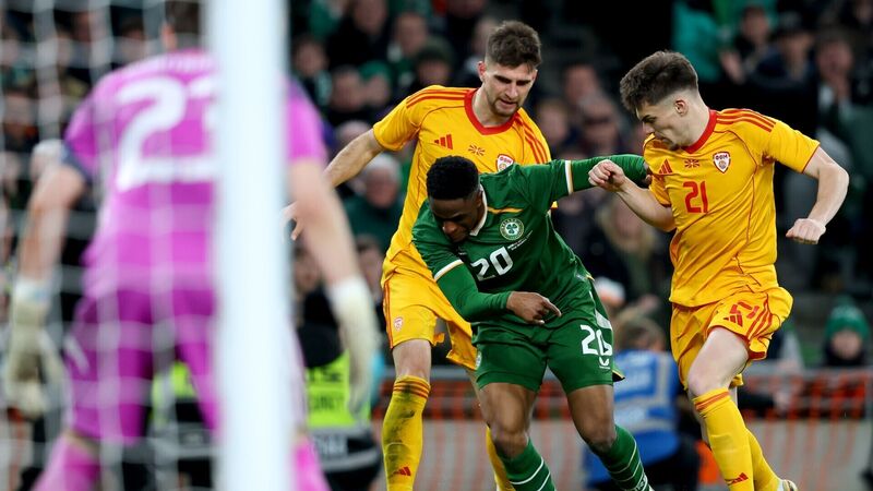 Republic of Ireland vs North Macedonia: Ireland's Chiedozie Ogbene with Imran Fetai and Reshat Ramadani of North Macedonia