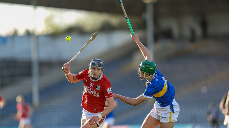 Cork's Sam Ring competes for possession with Tipperary's Conor Collins duirng their Munster Minor Hurling Championship in Semple Stadium.