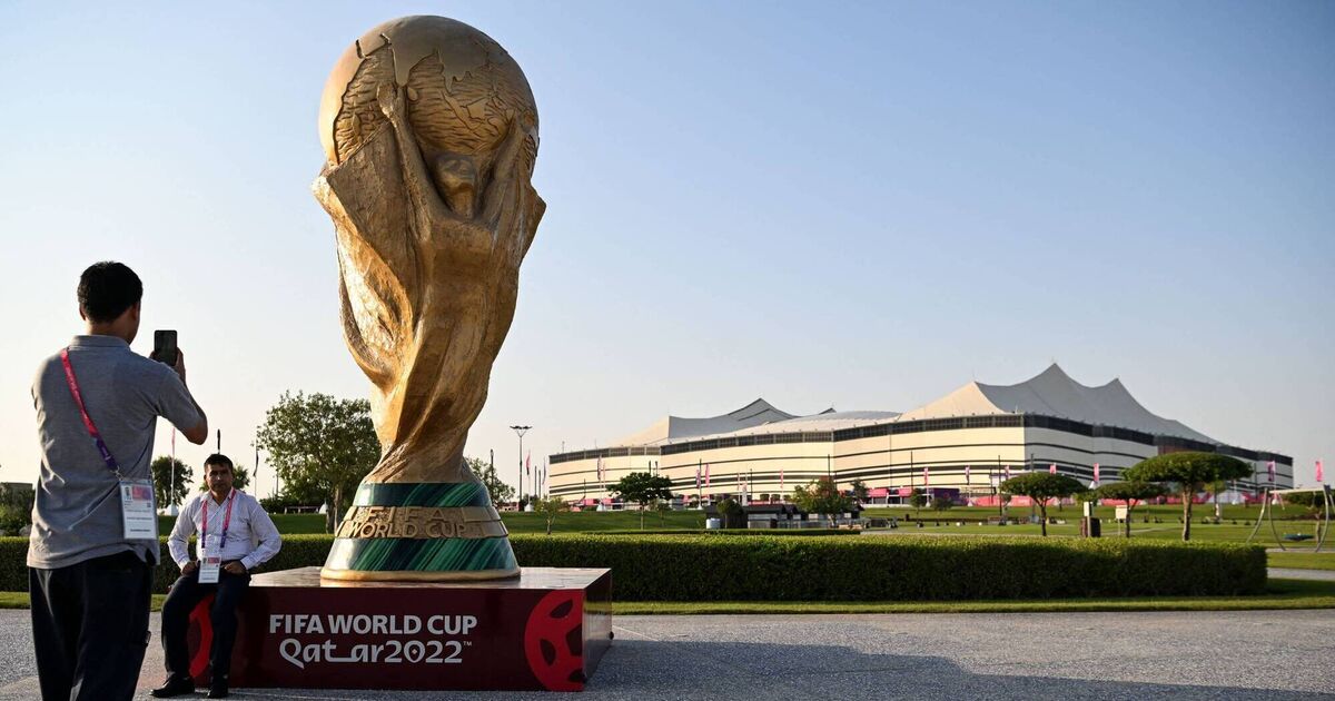 A man takes a picture of a FIFA World Cup trophy replica in front of the Al-Bayt Stadium in al-Khor ahead of the Qatar 2022 FIFA World Cup football tournament. Picture: KIRILL KUDRYAVTSEV/AFP via Getty Images