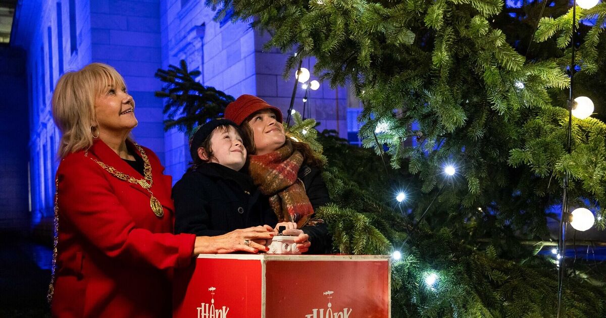 Lord Mayor Cllr. Deirdre Forde, Oisín Robinson and Lorraine O'Sullivan join together to light Cork City up for Christmas. Picture: Alison Miles /OSM PHOTO
