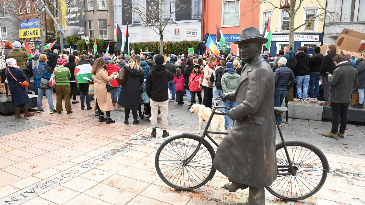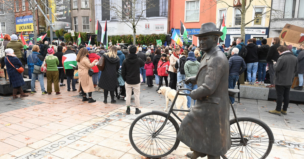 A rally by the Cork Palestine Solidarity Campaign in Cork City last Saturday winds past the new statue of Michael Collins. Picture: Larry Cummins