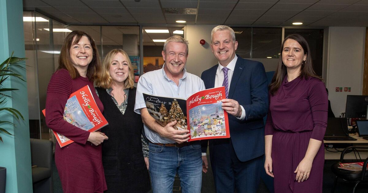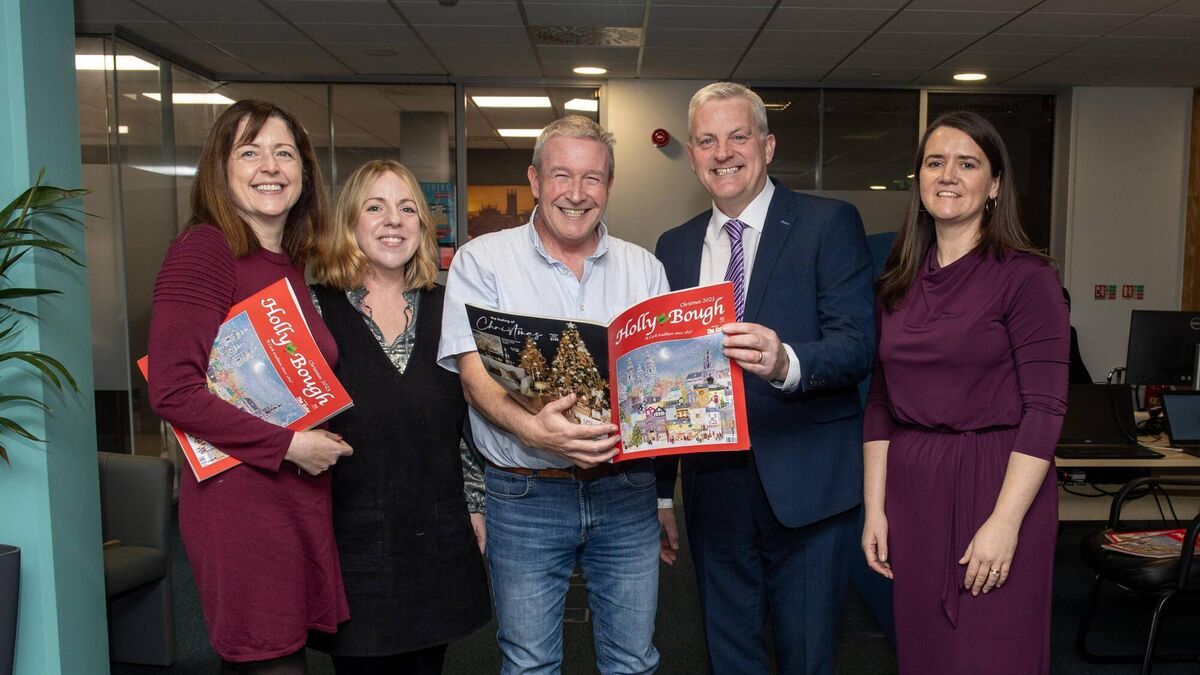 Folklorist Shane Lehane (centre) with the Holly Bough along with, from left, Gráinne McGuinness, editor of The Echo; Fiona Foley, artist who designed the 2023 Holly Bough cover; John Dolan, editor of the Holly Bough; and Karen O'Donoghue, managing director of the Irish Examiner and The Echo. Picture: Dan Linehan