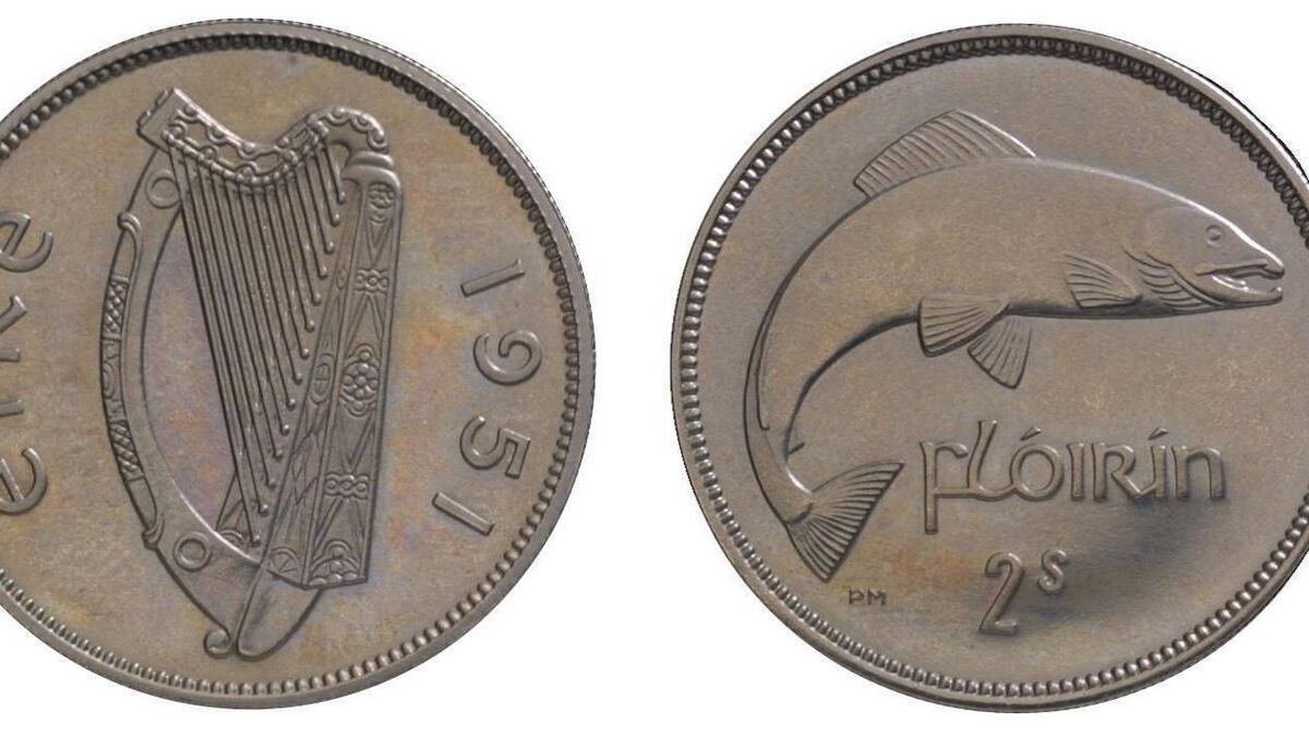 The Irish florin, with the motif of the leaping salmon on one side, the harp on the other